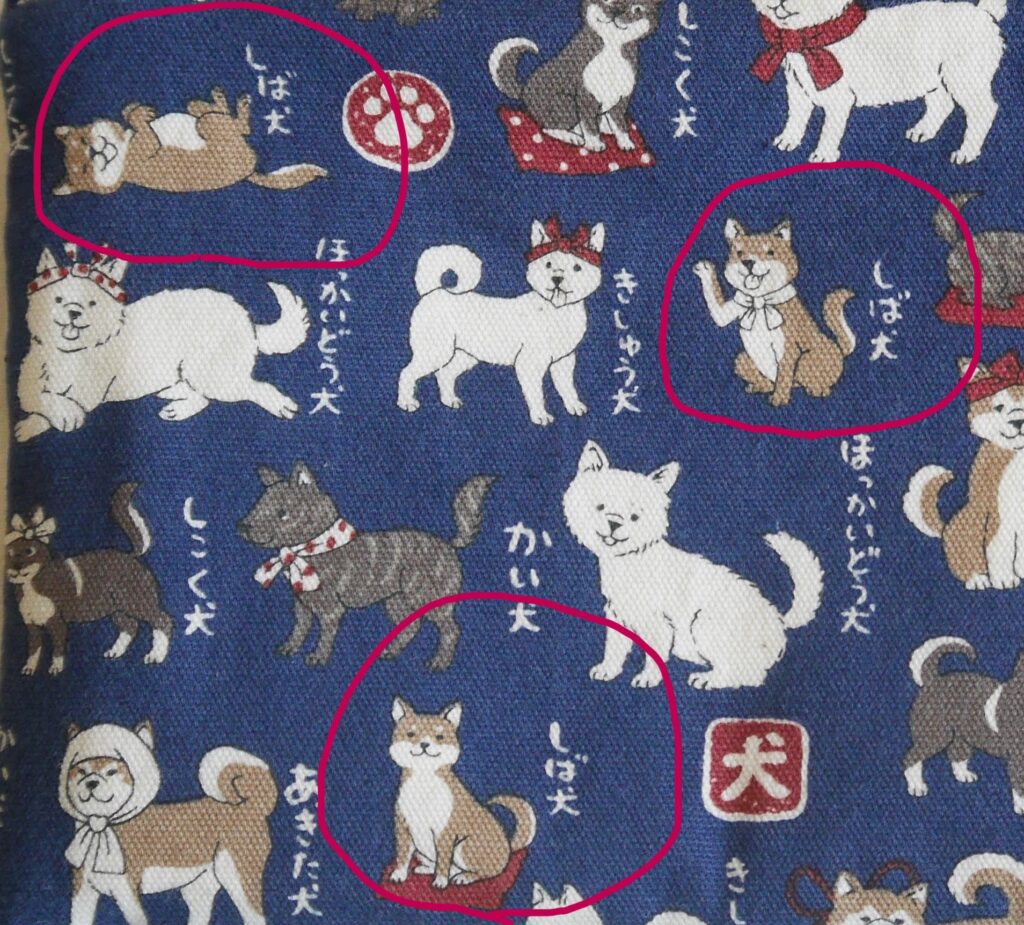 これは和犬が描かれた生地でポーチを作っています。犬柄で犬が好きな人にはたまらない生地ですが、もっとよく見てみましょう。