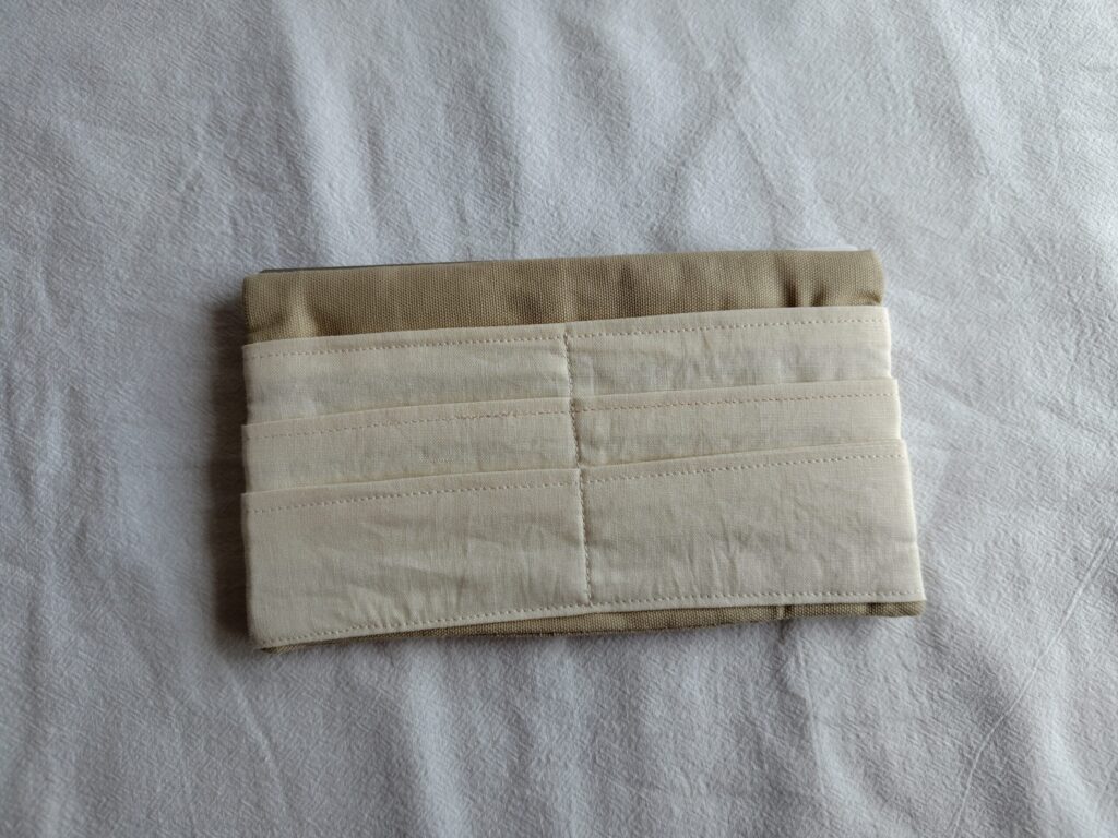 あと、このポーチには中にポケットや仕切りがありません。なぜかというと、何度か内側にポケットつけてみたのですが、そこで引っ掛かってスムーズに入れれないことがあったからです。