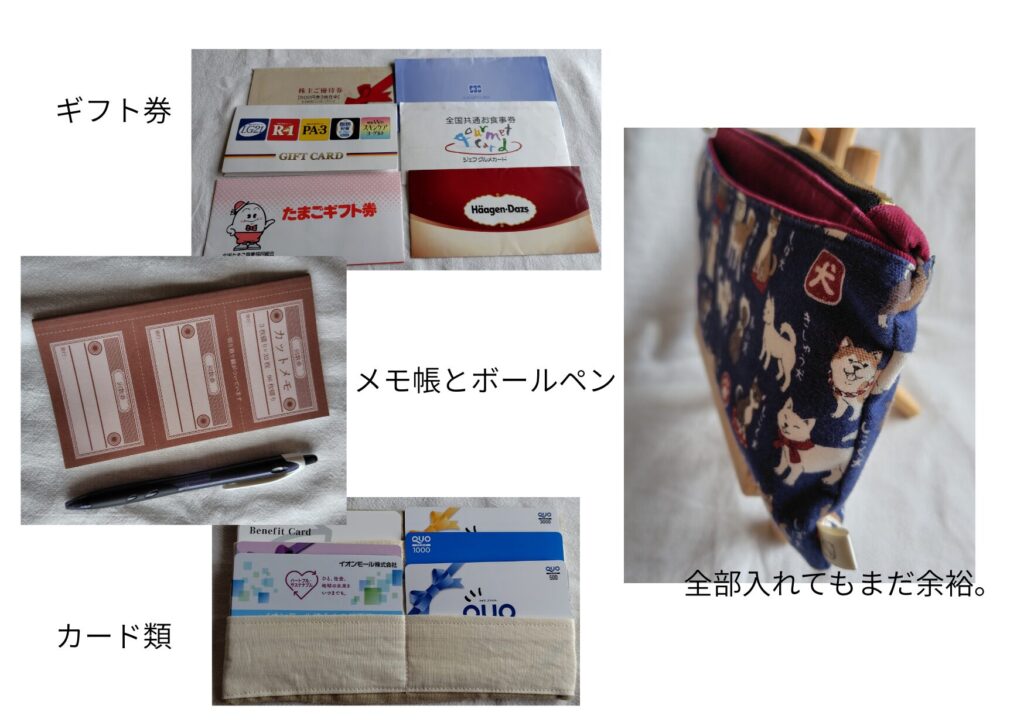 株主優待券や広告の割引券なども入れていつでも使えるように第二のお財布にしてカバンに入れています。あと、あると便利な筆記用具を外側のポケットに入れてます。全部入るのにスリムなのがうれしいです。